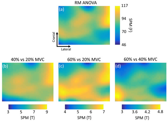 To assess the effect of contraction intensity on EMG distribution, we employed SPM [2,5]. SPM conducts pixel-level statistical tests using random field theory to make probabilistic conclusions based on the random behavior of the 2D observational unit [2,5]. The result is a continuous statistical map that can be viewed in the context of the original HDEMG images. We performed an SPM repeated measures (RM) one-way ANOVA (F statistics) to establish the effect of contraction intensity (20%, 40%, and 60% of MVC) on muscle activity distribution. Then, a priori planned post-hoc comparisons (T statistics) were incorporated into the design to compare the different intensities. The result of the analysis was a summary statistic image (F and T distribution maps) with the same size as the topographical maps (70 × 60 mm). In all statistical maps and tables, SPM inference is reported at a threshold of p < 0.05, with family-wise error (FWE) correction for multiple comparisons [5] based on random field theory. SPM image analysis was performed using SPM12 software.