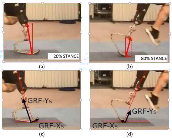 Frames showing ground reaction force (GRF) components in global reference frame for an elite sprinter, from [10]: (a,b) Global components at 20% and 80% stance; (c,d) GRF resolved in the socket reference frame for the same instants of 20% and 80% stance.
