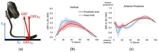 (a–c) GRF components in global reference frame for an elite sprinter [10]: (d–f) GRF resolved in the socket reference frame for all stance phases.