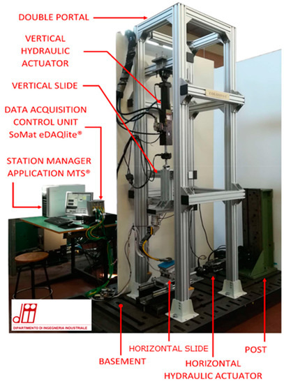 The multicomponent test bench developed at the Department of Industrial Engineering, University of Padova, with indication of actuators parallel (vertical) and normal (horizontal) to the socket/pylon axis.