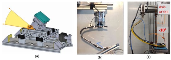 Detailed view of the horizontal slide of the bench and running prosthetic feet (RPFs) under test: (a) Horizontal slide with swiveling plane covered with tartan supported by a triaxial load cell, oriented at -30° from the socket axis; (b) running prosthetic foot (Ottobock Runner Cat 3) under test in the multi-component-prostheses-test-bench. Upper 6-axis load cell and lower 3-axis load cell are in evidence, with the surrogate ground oriented at +30° from the socket axis. (c) Setup of the drop test on Ossur Cheetah Cat5 with surrogate ground oriented at -10° from the socket axis.
