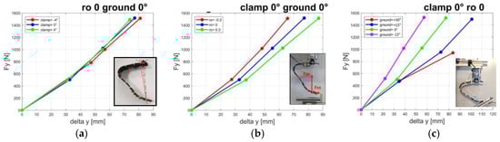 Results of static stiffness tests on Ottobock 1E91 Standard Runner Cat 3: (a) The effect of clamp location along the proximal portion of the foot; (b) the effect of load ratio (ρ = ro) between normal Fxs and parallel Fys forces; (c) the effect of foot–ground inclination angle θ on the stiffness curve.