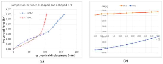 Results of dynamic tests performed on the C-shaped Ottobock 1E91 Custom Runner cat3 and J-shaped Ossur Cheetah Xtreme cat5 during dynamic stiffness tests are reported in Figure 6a. The two RPF load-deflection curves exhibit a bilinear behavior, with a slope change at around 1500 N for both. The stiffening of the two feet is quite different, with the Ottobock foot reaching a deflection 160% larger than the Ossur deflection at the peak load of 3500 N.