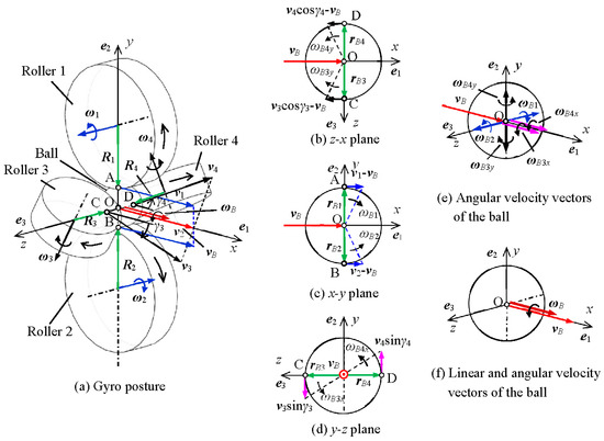 Linear and angular velocity vectors in the four-roller ball throwing mechanism by gyro posture: (a) Gyro posture; (b) z–y plane; (c) x–y plane; (d) y–z plane; (e) angular velocity vectors of the ball; (f) linear and angular velocity vectors of the ball. When the linear velocity vectors are ν1 = ν2 = ν3 = ν4, and the linear velocity vector νB and angular velocity vector ωB of the ball are in the same direction, a gyroball can be thrown.