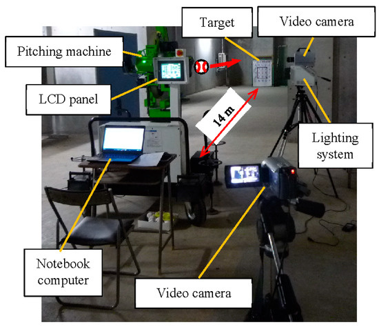 The four-roller baseball pitching machine based on the above throwing mechanism was designed and prototyped as shown in Figure 2. Each roller is directly connected to a motor, and the inverter device performs precise control of the rotation speed. The elevation and azimuth of the ball launch outlet can be adjusted. The pitching test was conducted using the four-roller baseball pitching machine. Figure 3 shows the setup of the pitching test. Using the prototyped pitching machine, ten baseballs were thrown at a target distance of 14 m using three typical pitch types (i.e., fastball, curveball, and gyroball).