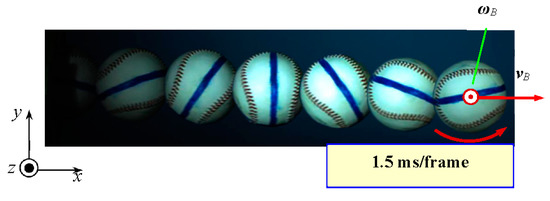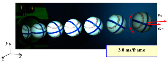Stroboscopic image of a baseball thrown as a fastball. The ball speed V is 161 km/h and the rotation of the ball is a back spin. The ball spin rate S is 3700 rpm, and the spinning axis of ωB is in the direction of the z-axis.