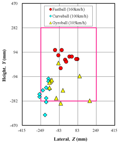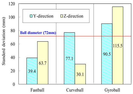In order to quantitatively evaluate these position errors, the standard deviations of the position error in each of the three pitch types were calculated and are shown in Figure 8. The results show that in the cases of the fastball and curveball, the errors in the Y and Z directions were within 77 mm, which is only approximately the diameter of one baseball (72 mm). The maximum position error in the case of the gyroball is 116 mm, which is equivalent to 1.5 times the diameter of a baseball. All of the position errors are smaller than those of the three-roller baseball pitching machine developed by us previously.