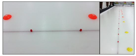 A competitive curling athlete (male, 20 years, 113.6 kg, 185 cm) was asked to sweep as hard as possible on the centerline as if it were a draw shot (slow translational velocity), in between two pylons. Following this amount of sweeping, VPS was placed into hollow red cylinders to keep samples of similar size (