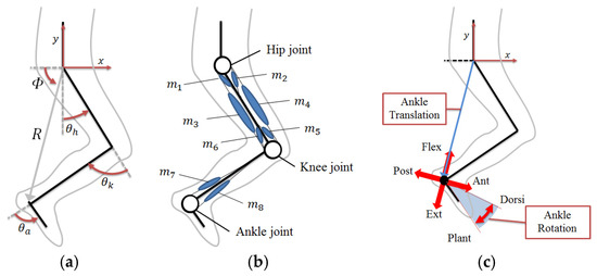 Definition of musculoskeletal model of lower limb. (a) Kinematic joint angle and ankle position. (b) Measuring muscles. (c) Ankle translation/rotation, Ext/Flex, Ant/Post, and Plant/Dorsi.