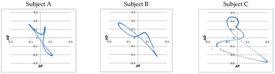 According to the previous study [6], it is already known that runners have three different preferences for running shoes. Figure 2 shows the typical results of ankle EP trajectory of three runners (A,B,C). Each runner shows the different trend of ankle EP trajectory. In particular, there is a widespread distribution in the third quadrant in Subject C compared to Subject A and Subject B.