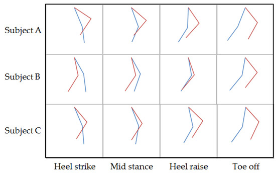 Figure 3 shows the lower-limb EP postures and actual motions of the runners shown in Figure 2. The ankle EP was calculated using Equation (11). The EP posture preceded the actual leg posture in almost all aspects. Even though all runners showed similar postures at the toe-off phase, there were big differences at the heel strike phase. The EP posture of Subject B was situated behind the actual motion. On the other hand, the EP postures of Subject A and Subject C were situated in front of the actual motions.