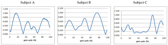 To distinguish the characteristics of ankle EP control among the runners with different shoe preferences, we calculated ankle EP velocity during running. Representative runners (Subjects A, B, and C) showed different trends of ankle EP velocity (Figure 4).
