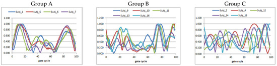 To examine the similarity of ankle EP velocities among 14 runners, we calculated a correlation coefficient for all runners. Some runners showed a high correlation between each other. Based on these results, we finally classified the 14 runners into three groups. Runners in Group A and Group B showed strong similarity, respectively (r = 0.55 to 0.89 for Group A, r = 0.51 to 0.86 for Group B), but there was weak similarity (r = 0.01 to 0.32) in Group C (Figure 5).