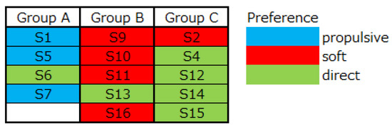According to the previous study [6], we categorized runners into three clusters. Each cluster prefers specific feelings of running shoes (i.e., cluster A prefers propulsive feelings, cluster B prefers soft feelings, and cluster C prefers direct feelings from the ground). To know the relationships between runners’ preferences and ankle EP velocity, we examined those of Group A to Group C (Figure 6). These results indicate that the runners categorized by ankle EP velocity show similar preferences for running shoe feelings.
