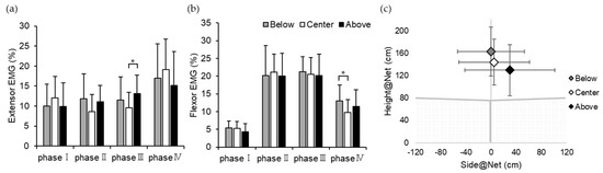 | Racquet rotation (deg) | −1.1 | (1.7) | 0.8 | (1.6) | 3.0 | (1.7) ** | |