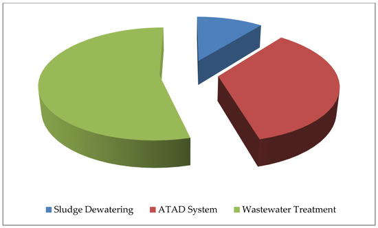 Due to the high rate of oxygen absorption by thermophilic organisms, there are high energy requirements for reactor aeration. The obvious disadvantage of the process of autothermal thermophilic stabilization is the cost of aeration, which, however, can be significantly reduced if the equipment is properly designed and the system is correctly operated. The percentage share of individual technological processes in the total annual electricity consumption in one of the sewage treatment plants is shown in Figure 1.