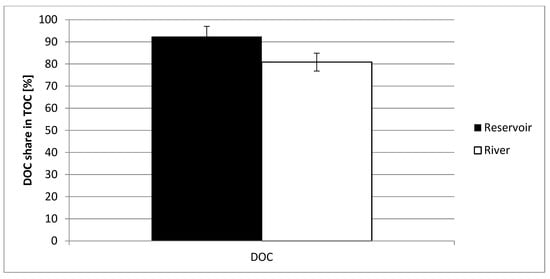 In case of water samples taken from the reservoir, the dissolved organic carbon is about 92% of total organic carbon. The water sample taken from the river DOC makes up to 80% of TOC. In Figure 2, BDOC share in DOC in both cases, the reservoir and the river are shown.