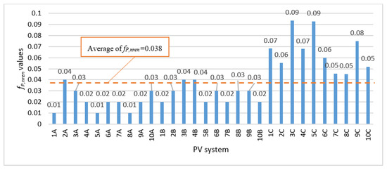 The data presented in Figure 1 shows that the average numeric indicator of fP,nren factor in PV systems is 0.038 (the dotted line). The average numerical value of fP,nren indicator for PV systems of A group, where the capacity of PV systems are more than 20 kW equals to 0.021. A similar result was set in B group, where the capacity of PV systems is 20 ÷ 10 (kW)—the average of fP,nren equals to 0.028. However, the average of fP,nren value for C group (capacity is less than 10 kW) reaches 0.065.