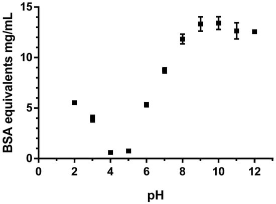 Quinoa protein solubility at different pH values. Obtained from aqueous suspensions of defatted flour (1:10 w/v) maintained at a constant pH (NaOH or HCl) for 10 min at 30 °C and 100 rpm. n = 2. Values (mean ± SD) are expressed as bovine serum album equivalents mg/mL.