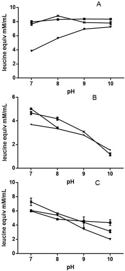 Leucine equivalents produced at different pH levels and temperatures by three enzymes (substrate enzyme ratio 1:10). (A) alcalase; (B) flavourzyme; (C) protamex. Temperatures: 40 °C (▼); 50 °C (×); 60 °C (■). Results (mean ± SD) are expressed as mM/mL of supernatant after 10 min of hydrolysis (n = 2).