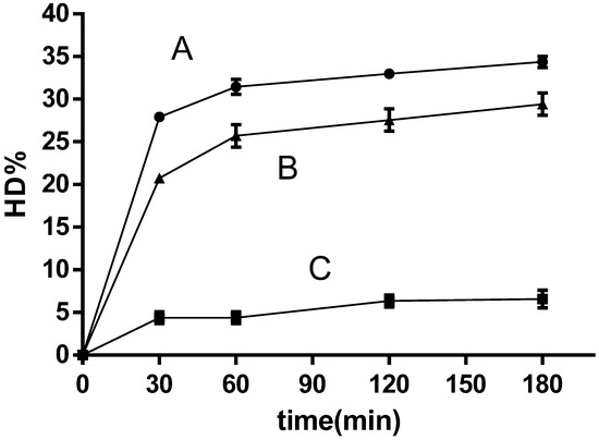 As shown in Figure 4, the hydrolysis of quinoa protein follows an enzyme dependent hydrolysis pattern. Curves show a high rate of hydrolysis in the first 30 min with alcalsa (27.9%) and protamex (20.7%) and evolves at low velocity for flavourzyme (4.3%). Thamnarathip et al. [13] achieved 13–14 HD% by employing alcalasa, flavourzyme and rice bran protein after 6 h.