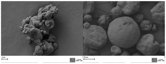 SEM micrographs of powders (Figure 2) showed tiny agglomerates, especially for a TF-SD, which are typically produced by twin-fluid atomizers and aid in the redispersion process [4]. On the other hand, round-shaped particles of greater size and no evident agglomerates were observed for the SF-SD.