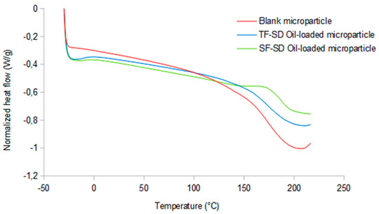 The thermal performance of the powders compared with a blank microparticle was assessed. It was found that all formulations showed two main stages of mass loss (curves not shown). The first stage, below 100 °C, was related to the loss of adsorbed and bound water, and had a small weight loss for all microparticles. The onset temperatures for the second degradation stage were around 250–260 °C for all samples. These temperatures were in consonance with values reported for the wall materials of the present work, and corresponded to SPI pyrolysis (~270 °C, Song et al. [11]) and the thermal degradation profile of polysaccharides (Castro-Cabado et al. [12]). Finally, glass transition temperatures (Figure 3), as shown by the DSC curves, were around 172, 169 and 186 °C for blank, TF-SD and SF-SD microparticles, respectively, in accordance with the reported values for MD DE 5 [3], GA (Barros Fernandes et al. [13]) and SPI (Tang et al. [14]).