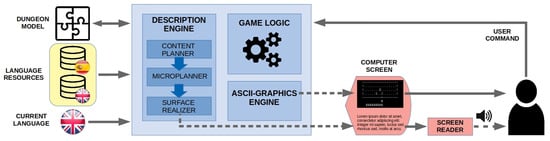 Figure 1 shows the general architecture of our games. The main difference with respect to regular roguelikes is the addition of a so-named Text Description Engine module. This new component takes as input the (current) world model and, together with the information provided by the game logic in response to the commands of the user, it generates a textual description of the dungeon and what is happening within the game. Such description is generated according to the linguistic resources available and the language selected. This new module follows the classic architecture of a Natural Language Generation (NLG) system, consisting of three stages [3]: