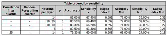 A summary of the obtained results can be seen in Figure 1. Each row of this table represents a tested model, where the first and second columns define the filters of characteristics used. These filters are represented with the value of the quartile selected for training. The third column shows the architecture of the networks by showing the number of hidden neurons per layer. The fourth column contains the p-value obtained from a Tukey–Kramer paired analysis, after previously performing a ANOVA analysis. Additionally, the remaining columns show the performance measures obtained in the test, that is, the average accuracy, average sensitivity, average kappa coefficient, minimum accuracy, minimum sensitivity, and minimum kappa coefficient.