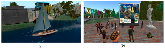 Two screenshots of the workshop for medical teachers held in the virtual place “The Medical Master Island”: (a) A guided visit by boat around the island; (b) A session about technical possibilities of Second Life, rendering objects and sculpted figures, and explaining the activity of the former “Isla de la Salud” owned by the Spanish Association of Family and Community Medicine (SAMFYC).