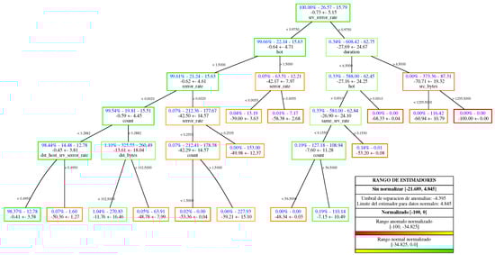 Explanatory tree after pruning () using the KDDCup99-SMTP dataset. Named sequentially, reading from left to right, each node shows: the proportion of elements that it represents regarding the full dataset (shown in blue), overall variance (shown in blue), the weighted variance w.r.t children nodes (shown in dark blue) and mean and standard deviation for the subset of estimators. Further experimental results are given through supplementary materials reference.