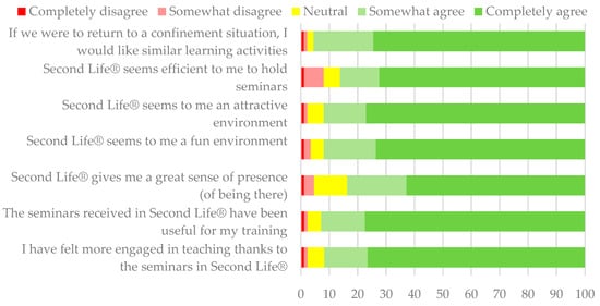 Second Life® is not a new educational resource in the subject of Radiology, as it has been used since the 2011–12 academic year without interruption [,,,,]. This has allowed the virtual environment to be prepared for use in this critical situation. In fact, both the conferences with guest professors and the inter-university competitive game were activities scheduled before the state of alarm. These projects and the 3D platform were explained to all students at the beginning of the course, on February 14th. A month later, students suddenly found themselves in a situation of uncertainty, confined to their homes, not knowing how their training would be resolved. The practical seminars, which are essential in this subject, allowed for synchronous contact with their teachers, maintaining the scheduled calendar and providing a situation of linkage and continuity with the academic activity. The seminars with guest professors and the competitive game have provided complementary training options. The evaluation, which was usually done orally, has allowed Second Life® to be offered as a synchronous examination platform.