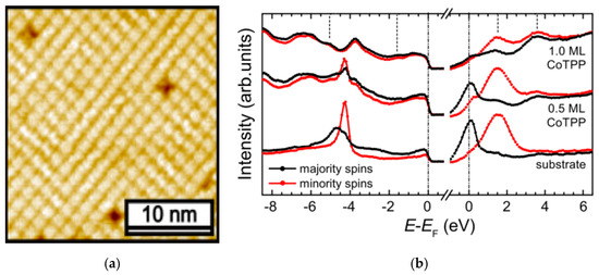 (a) Scanning tunneling microscopy (STM) image acquired on 1 monolayer (ML) of CoTPP on Fe(001)-p(1 × 1)O. (b) Spin-resolved photoemission spectroscopy (SR-PES) and inverse photoemission spectroscopy (SR-IPES) spectra for different CoTPP coverages on Fe(001)-p(1 × 1)O. The majority and minority labels refer to the substrate magnetization.