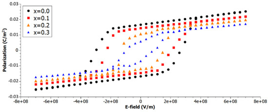 As illustrative example for the suitability of our simulations, hysteresis loops at different concentrations of Zr in Ba(Ti1−xZrx)O3 are presented in Figure 1. The graph shows the decrease in remnant polarization (which is beneficial to high energy density) by increasing the amount of Zr in the system. This is accompanied by the decline in maximum polarization, which in turn reduces the energy density. Thus, it is clear that an optimum concentration must be found where energy density is maximized.