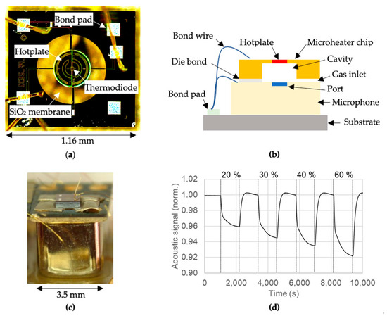 (a) Optical image of the microheater chip used for the thermal acoustic gas sensor; (b) schematic diagram showing the sensor construction; (c) image of the fabricated sensor; (d) response to various CO2 gas concentrations.