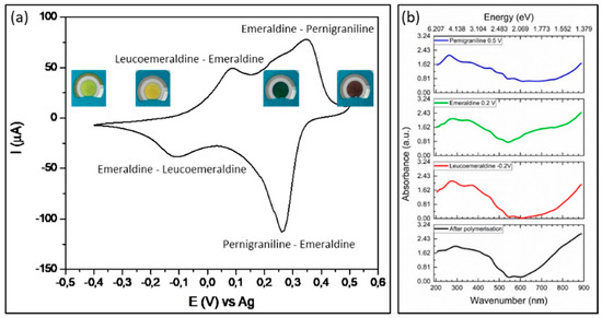 (a) Cyclic voltammetry (CV) with color changes (insets) of polyaniline (PANI) forms and (b) UV/VIS spectra of the PANI oxidation forms obtained at certain potentials (−0.2 V, 0.2 V, 0.5 V and −0.3 V vs. Ag) in air.