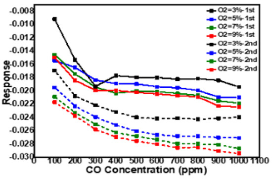 The measured sensor responses to 100–1000 ppm CO during two identical test runs conducted at four different O2 concentrations and a sensor operation temperature of 500 °C were recorded (see Figure 1). The results indicate that for each oxygen level in both the first and second measurements and for all the carbon monoxide concentrations, there is no transition temperature, but the sensor signal slightly decreased with increasing concentrations of carbon monoxide, indicating that the major response mechanism behind the sensor response changes during CO exposure at elevated temperatures (here, 500 °C) and relies on the removal of oxygen from the surface, rather than CO adsorption. This is in contrast to earlier observations at lower temperatures (around 200 °C), for which a strong correlation with the CO oxidation kinetics on a Pt gate has been found. Previous studies [2] have reported a strong dependence of the CO response of Pt-gate MISFET sensors on both temperature and the CO/O2 ratio, the sensor exhibiting a clear CO-surface-coverage dependency correlating well with the surface poisoning phenomenon, as clearly manifested by the binary high-to-low switch in the sensor response upon the ignition of the surface CO oxidation reaction, i.e., when the surface of the Pt gate material changes from being CO covered to more or less oxygen dominated [3]. When looking at the CO responses (CO 300/800 ppm and O2 5%) found for the Pt/Al2O3 gate sensors at different operating temperatures (see Figure 2), such a CO-coverage-dependent response mechanism is not as clearly identified.