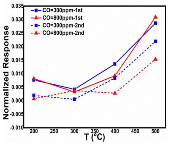 Additionally, contrary to what has previously been found for Pt-gate MISFET sensors [3], the CO responses above 300 °C increase with increasing temperature (Figure 2), even if some decrease in the response can be noted over time, which is normal for almost any sensor anyway; the observed response (especially for the somewhat lower CO concentration scale) at the high end of the temperature scale (400–500 °C) is a clear improvement as compared to Pt-gate sensors.