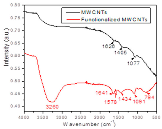 FTIR spectra of the Multi-Walled Carbon Nanotubes (MWCNTs) and functionalized MWCNTs.