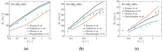 Comparison between experimental and computational premixed laminar flame speed when is (a) , (b) and (c) . Experimental results by Kumar et al. [44] plotted in conjunction with computational results using Nakamura’s mechanism [42], Otomo’s mechanism [31] and Duynslaegher’s reduced mechanism [34].