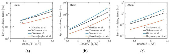Comparison between experimental and computational ignition delay time for the case of () at (a) , (b) and (c) . Experimental results by Mathieu et al. [40] plotted in conjunction with computational results using Nakamura’s mechanism, Otomo’s mechanism and Duynslaegher’s reduced mechanism.