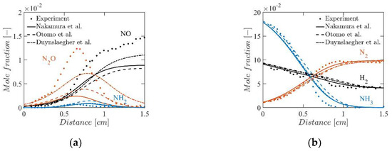 Comparison between experimental and computational concentration profiles of (a) and (b) for the case of at Experimental results by Duynslaegher et al. [35] plotted in conjunction with computational results using Nakamura’s mechanism, Otomo’s mechanism and Duynslaegher’s reduced mechanism.