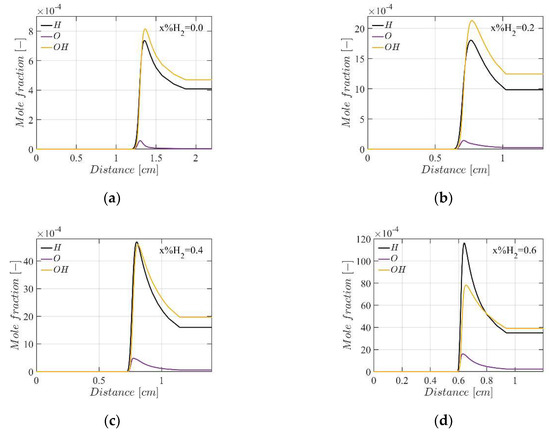 Radicals profiles of with hydrogen blending ratio at (a) , (b) , (c) and (d) .