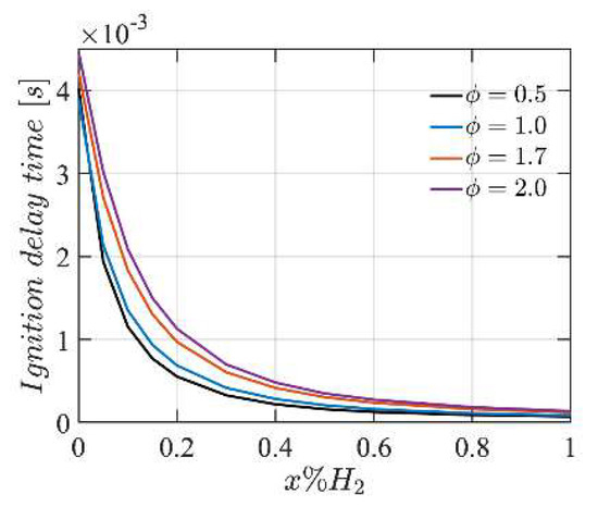 Ignition delay time as a function of hydrogen blending ratio for various equivalence ratios at initial temperature of and pressure of .