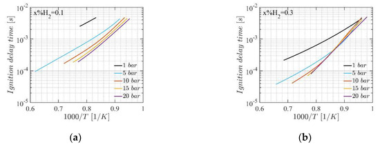 Ignition delay time as a function of under the initial pressure of at the hydrogen blending ratio of (a) and (b) .