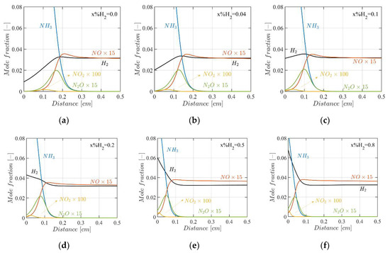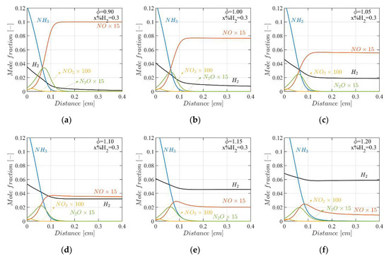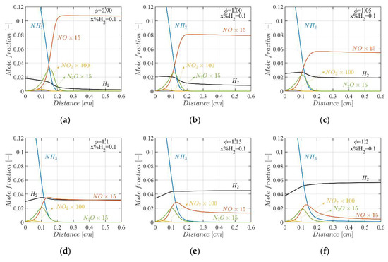 Species profiles of at the hydrogen blending ratio of (a) , (b) , (c) , (d) , (e) and (f) under initial temperature of and pressure of for equivalence ratio of .