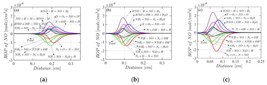 The effects of the initial temperature range of and the initial pressure range of on flame structure are demonstrated in Figure 15 and Figure 16, respectively. The hydrogen concentration in the fuel mixtures is set to , and the equivalence ratio is set to . The effect of the initial temperature is investigated at atmospheric pressure. Figure 15 indicates that concentration in the post-flame zone decreases from to as the initial temperature rises from to , although the increase in initial temperature is usually expected to promote the thermal formation. In a modelling study of a stoichiometric premixed flame by Xiao [46], emissions were found to rise with the increase in initial temperature. The unexpected reduction of under high initial temperature condition can be explained based on the ROP analysis shown in Figure 17. In a lower inlet temperature, fuel-bound is dominant in the production of nitric oxide, while thermal- contributes less; the reverse thermal- reaction is dominant in the consumption of nitric oxide, while the combination with contributes less. The same behavior is also found in the case with a higher inlet temperature, but the rate of both production and consumption is decreased, which could be the reason for the reduction in emission.