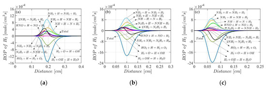 As reported, the reactions of dominate during the beginning of ammonia oxidation [44]. Mole fraction profiles of radicals in the flames with an equivalence ratio of are presented in Figure 6. With the increase in hydrogen blending ratio, the concentrations of are all increased—in particular, the radical of and . This means that the radical has a greater contribution to increasing the flame speed of the mixture. Similar behaviour is also found for fuel-lean and stoichiometric conditions [26,44].