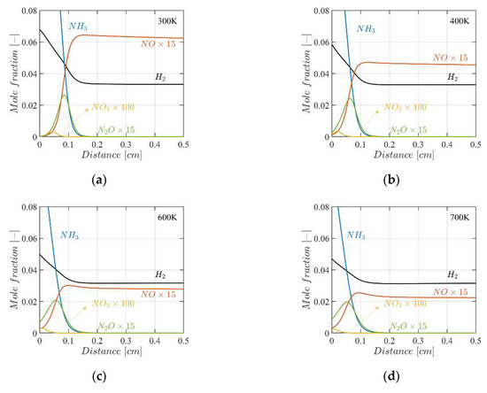 Species profiles of under the initial temperature of (a) , (b) , (c) and (d) at atmospheric pressure ().