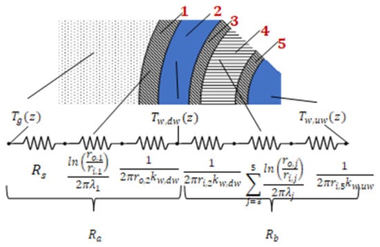 - WBHX: the thermal power exchanged between the circulating fluid and the far-field ground temperature is evaluated through a series of equivalent thermal resistances. The axial effects are neglected, however, and the temperature evolution of the fluid along the WHBX ducts is evaluated through the so-called “quasi-3D approach” [36,39]. At a given depth, z, the following differential equation applies: